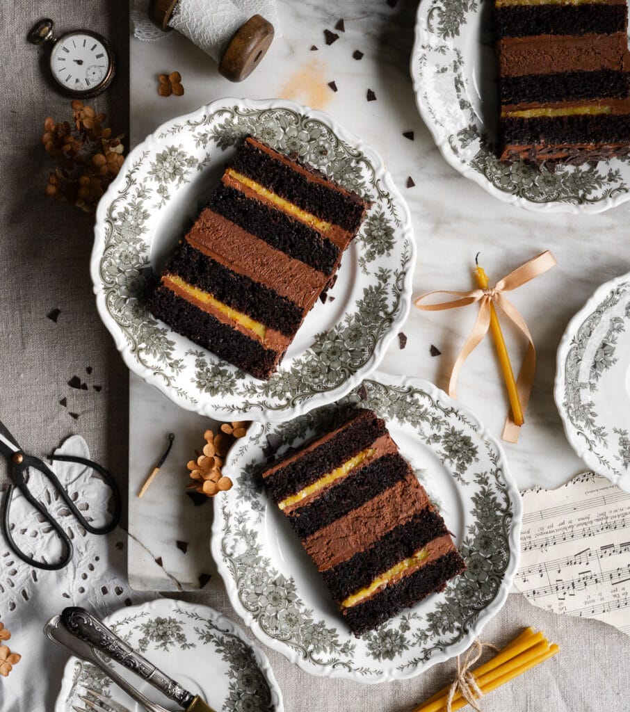 - Den ersten Tortenboden auf einen Tortenteller legen, mit Sojamilch tränken und eine dünne Schicht Buttercreme darauf verstreichen. Nun einen Rand aus Buttercreme spritzen und mit der Hälfte des Orangen-Curds füllen. Den nächsten Boden auflegen, ebenfalls mit Sojamilch tränken, und mit Buttercreme bestreichen. Die gefrorene Schokoladen-Mousse auflegen, und den Rand mit Buttercreme bedecken.Den nächsten Tortenboden auflegen und den ersten Schritt wiederholen. Die Torte mit dem letzten Tortenboden abschließen (dieser wird mit der Schnittseite nach unten zeigend aufgelegt, sodass die glatte Oberfläche nach oben zeigt). Die gesamte Torte mit Buttercreme einstreichen und mit der geraspelten Schokolade eindecken.250 g Geraspelte Schokolade, Sojamilch