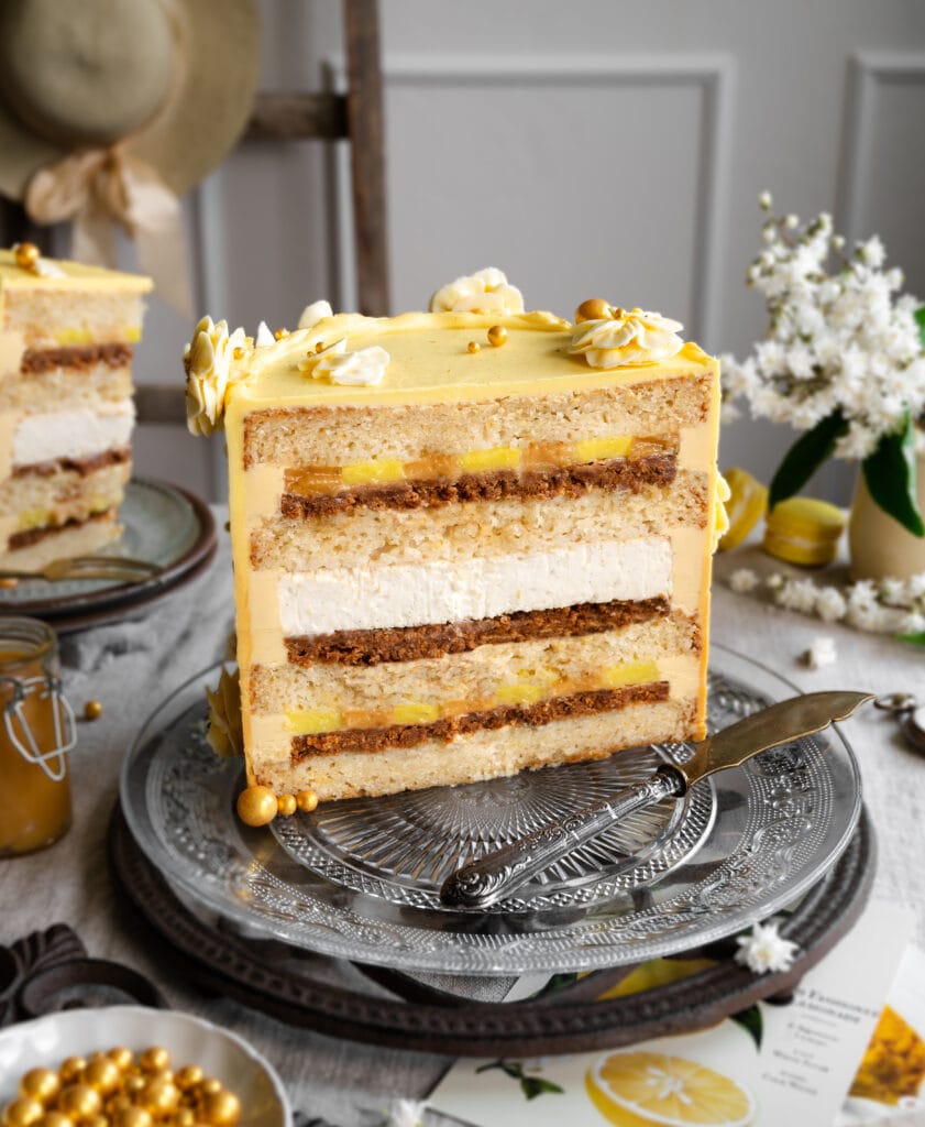 Es war Liebe auf den ersten Bissen und unerwarteter Weise wurde diese Torten-Kreation ein neuer Favorit in der Familie. Und außerhalb! Denn erst diese Woche habe ich die Zitronentorte für das obere Stockwerk einer Hochzeitstorte gebacken. Die verschiedenen Texturen, Geschmackskombinationen und Füllungen sind etwas ganz Besonderes. Lass uns von unten beginnen: