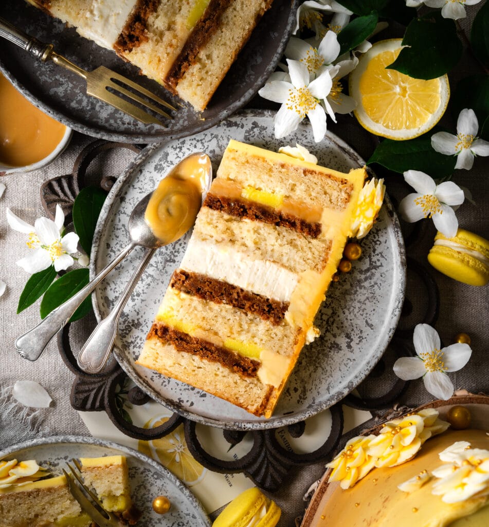 Was ich an dieser Zitronentorte so großartig finde ist das Zusammenspiel vom süßem Karamell mit intensivem Honiggeschmack und dem sauren Lemon-Curd. Dazu die knusprigen Keksschichten, die fluffig weichen Tortenböden und der cremige Käsekuchen. Der Käsekuchen kann jedoch super durch diese Mascarpone-Creme ersetzt werden.